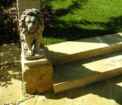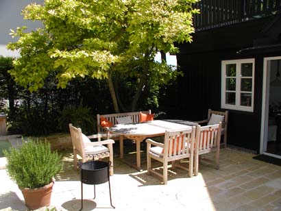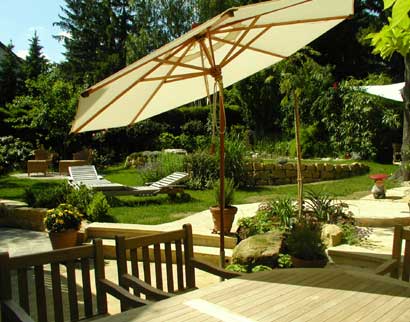 Großzügige Terrasse aus St. Margaretener Sandstein. Die Abgrenzung zum Gartenbereich wurde durch Niveauunterschiede und Bepflanzung erzielt.
