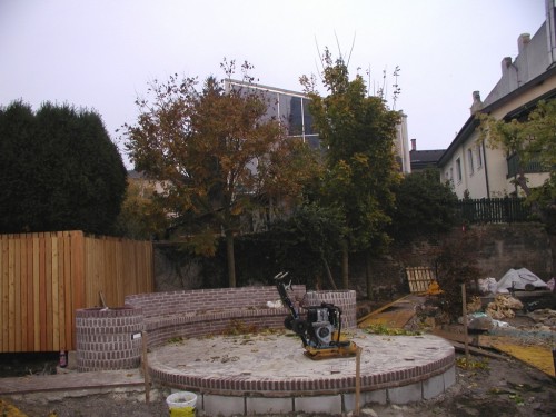 Das änderte sich aber bald. Die Konturen wurden klarer, man sieht, weswegen und wofür „gebuddelt“ wurde. Die Bäume bieten einen schützenden, Schatten spendenden Hintergrund für die sanften, ruhigen Elemente aus Klinker und Sandstein, die den zukünftigen Aufenthaltsplatz umrahmen: